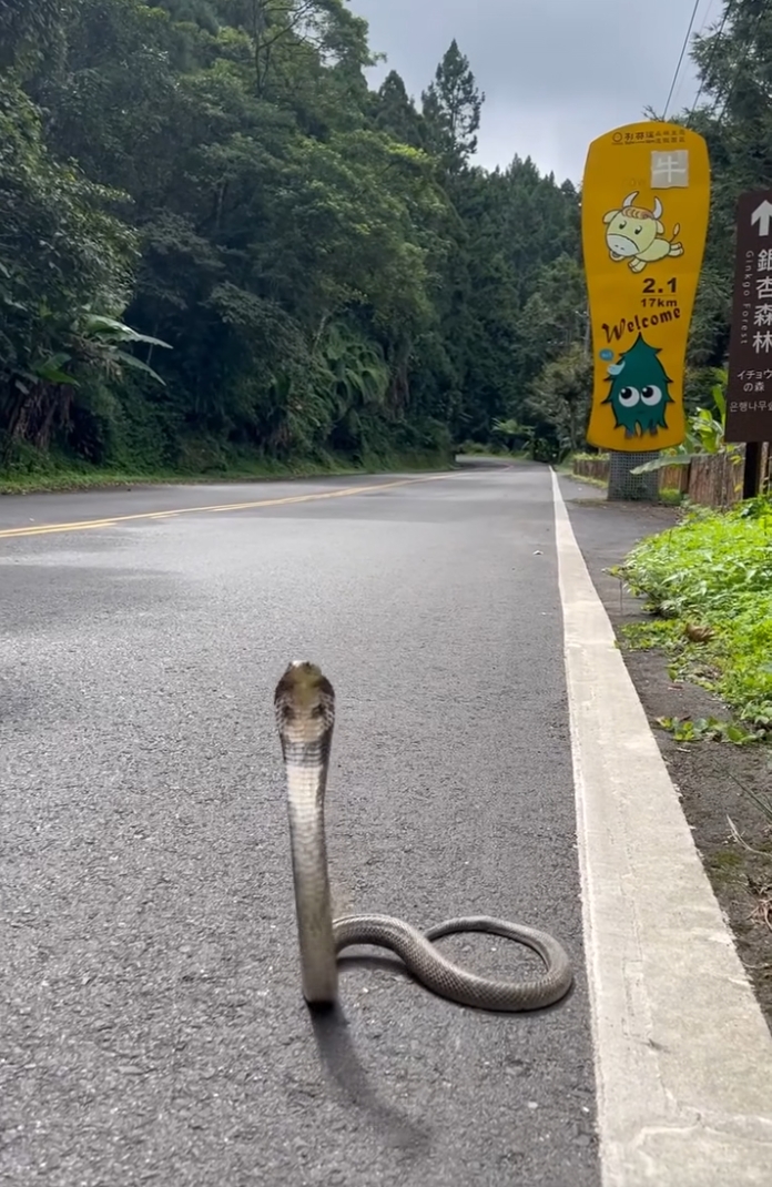杉林溪驚見眼鏡蛇「抬頭迎賓」!遊客嚇傻:比路標更顯眼的地標.(圖/翻攝 爆料公社 臉書)