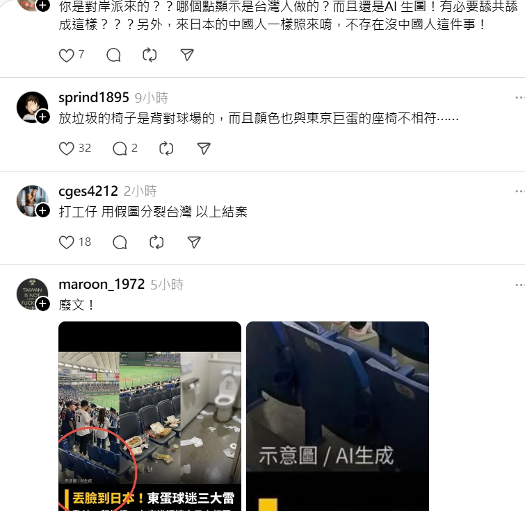 【Lai傳媒 記者爆料網/綜合報導】世界棒球經典賽(WBC)激戰正酣,台灣代表隊於東京巨蛋奮力拚搏,大批愛國球迷跨海應援,展現強大向心力。然而,社群平台 Threads 凌晨卻出現一則意圖不軌的貼文,利用 AI 生成假造圖片,誣指台灣球迷在東京巨蛋不守規矩、破壞公物。此舉隨即被眼尖網友識破,引發各界嚴厲譴責,痛批這是針對台灣球迷的「認知作戰」。
