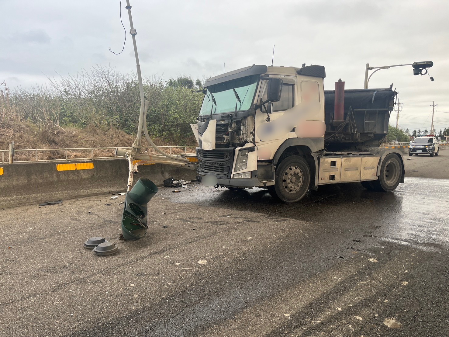 苑裡聯結車因司機彎腰撿手機自撞號誌桿。
