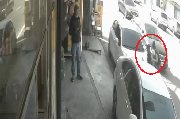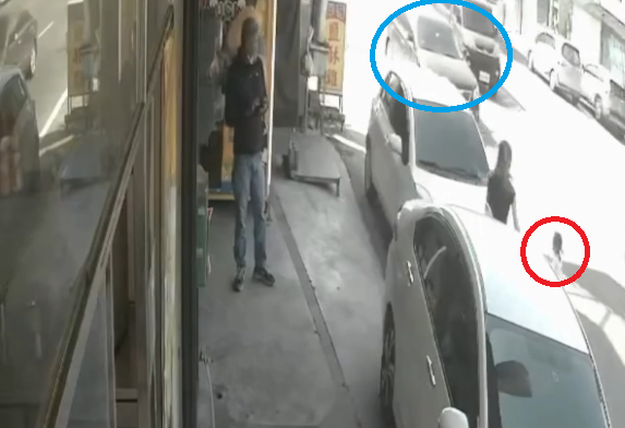 女童走上車道(紅圈處)旁邊有1輛汽車靠近(藍圈處),幸好母親即時查覺趕緊將女兒拉住,車子即時煞停。翻攝畫面