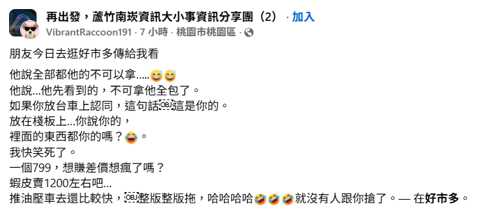 網友在Threads發文指出,12日到南崁好市多,遇到一個女的一大早全掃,還沒結帳就說她全要不能拿,結帳是67個,「我說要一個她說她全要了」,不滿說「憑什麼沒結帳看到就說她的」