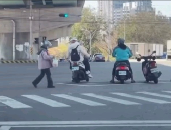 影片地點位在烏日區中山路三段與高鐵路一段路口。畫面中可見多輛機車在待轉格停等紅燈,其中一名女騎士突然把車停好後快步離開,直奔路旁水果攤。過沒多久,她提著水果迅速返回機車旁,時間點幾乎剛好卡在綠燈亮起前,彷彿精準計算過一般。
