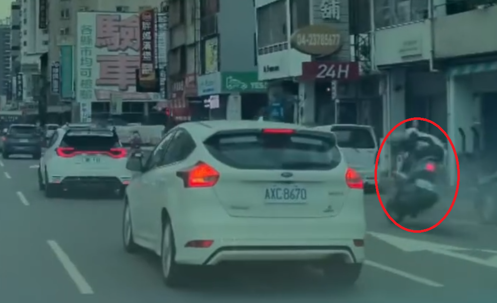 台中機車騎士自撞停路邊汽車倒臥車道上,再遭1輛汽車輾過手臂。翻攝畫面