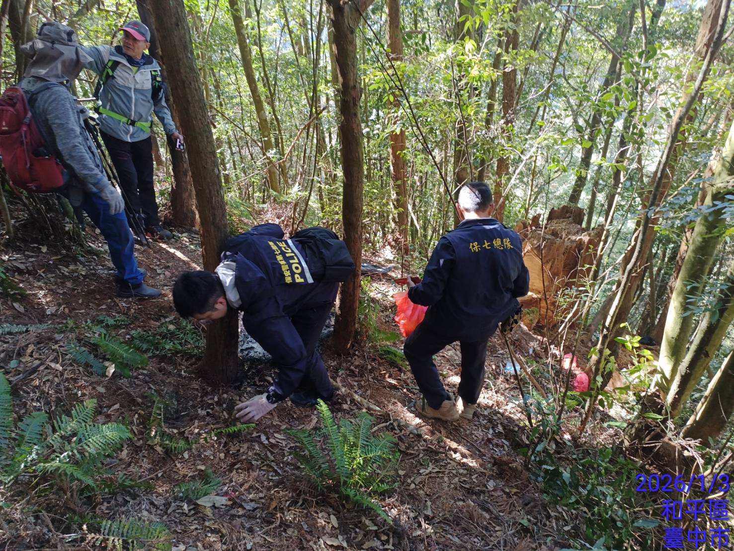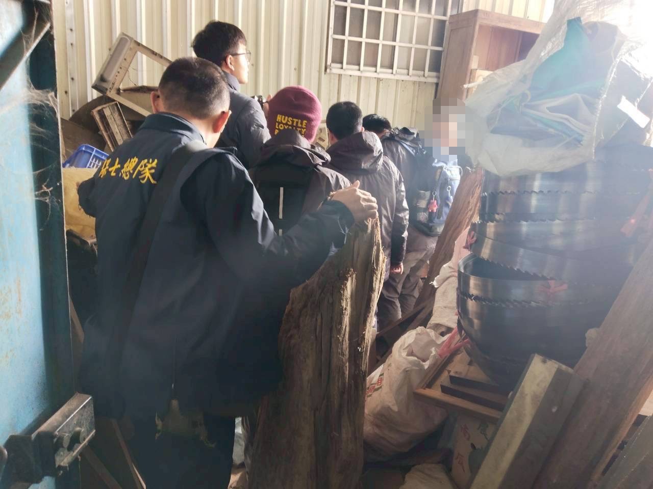 保七總隊第五大隊接獲農業部林業及自然保育署台中分署情資,有山老鼠由大雪山林道進入八仙山事業區第15林班盜伐台灣扁柏,報請台中地檢署指揮成立專案小組,經保七總隊第五大隊與林業保育署台中分署前往盜伐現場勘察採證,發現遺留鏈鋸、手鋸等贓證物。