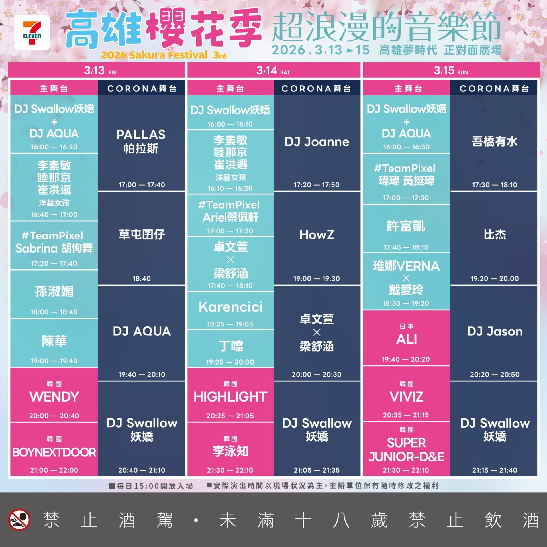 本屆櫻花季大舞台卡司星光熠熠,包括BOYNEXTDOOR、SUPER JUNIOR-D&E、HIGHLIGHT、李泳知、VIVIZ、Wendy、ALI等韓流卡司領銜登場;華語歌手部分則集結丁噹、孫淑媚、卓文萱、許富凱、戴愛玲、Karencici、梁舒涵、陳華、蔡佩軒等人接力演出。現場同時安排DJ演出與多組新生代創作歌手,讓舞台節奏從白天一路延續至夜晚。