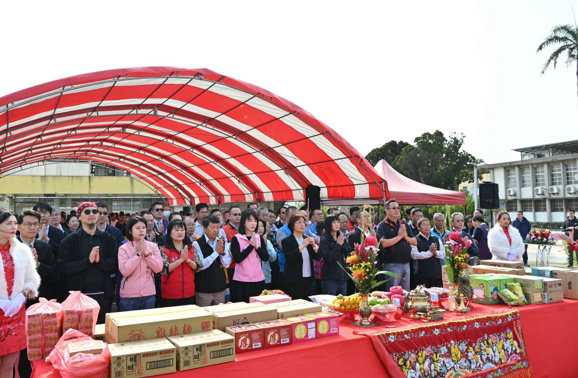 圖說;王惠美率埔鹽國中師生及地方士紳上香祈求活動中心興建順利