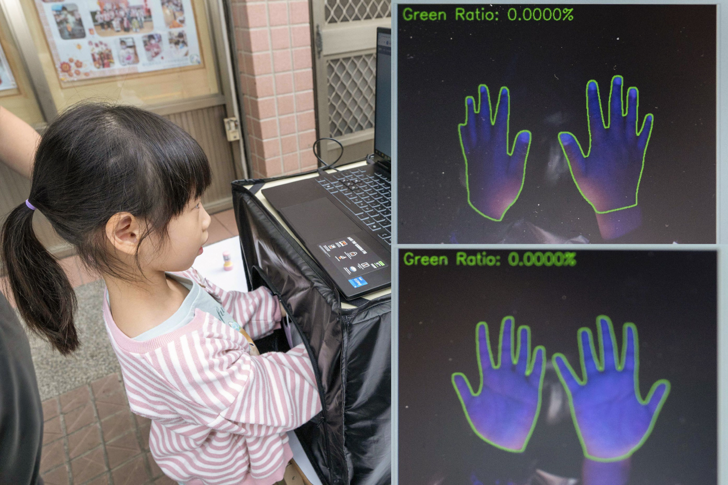 圖說:小朋友伸進ai檢測箱 就清楚的看出自已的手部那些地方沒洗到