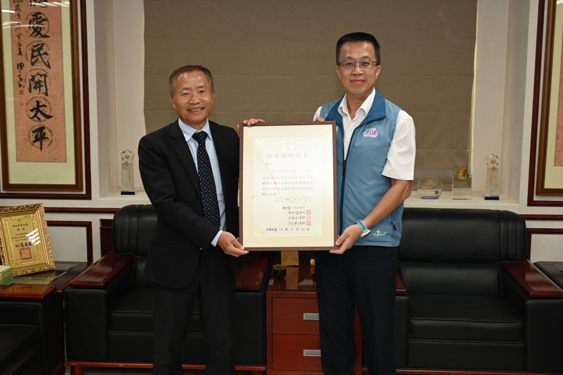 為紀念這段特殊的緣分,彰化縣警察局特別設計製作一座「戰警公仔法律顧問聘書」,並由陳局長親自頒發予陳律師。這座將警察形象與法律專業結合的公仔,除了象徵法律是警察執法的堅強後盾,也為嚴肅的聘任儀式增添活潑亮點,