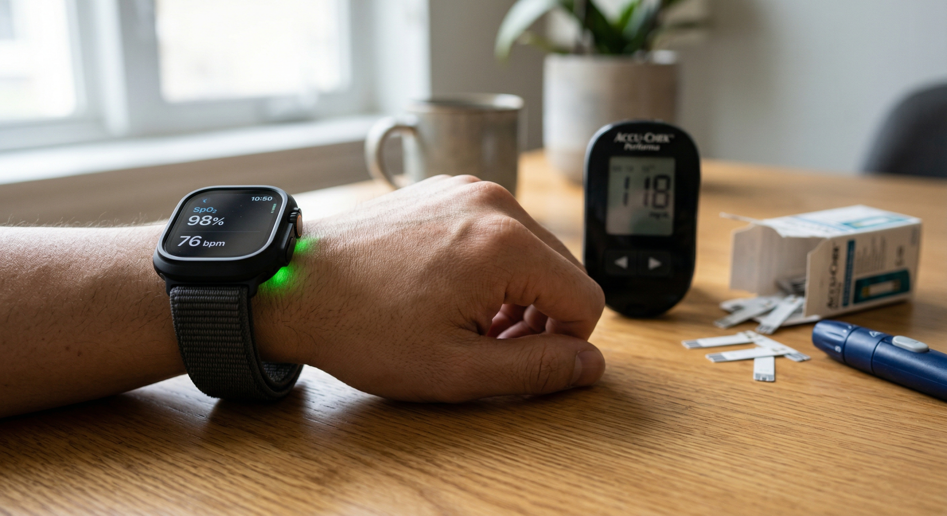 非侵入式光學感測成為穿戴裝置新焦點,但專科醫師提醒,現階段無創技術仍無法完全取代傳統指尖採血的精準度(示意圖)