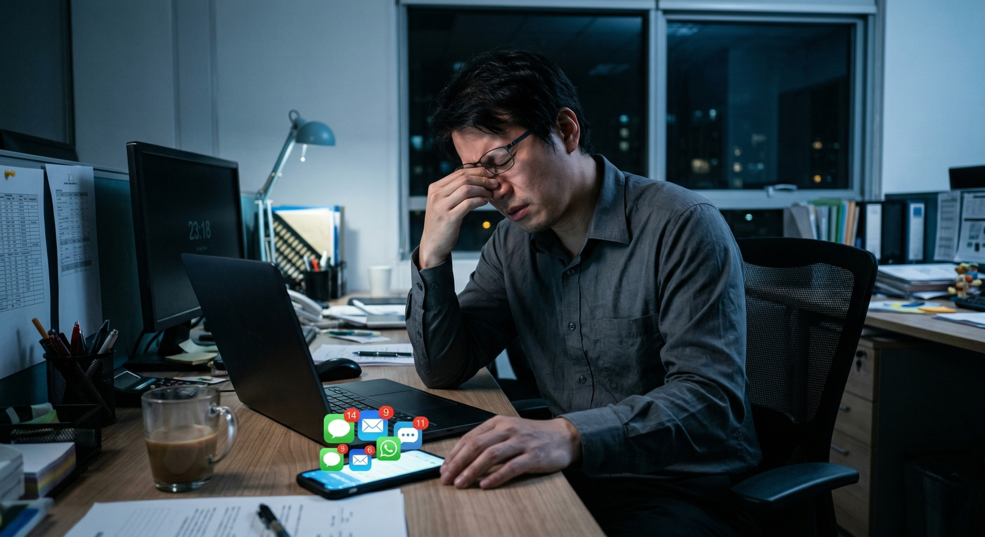 ​下班後仍持續接收工作訊息所引發的「數位過勞」,已成為現代職場不容忽視的心理健康隱憂(示意圖)