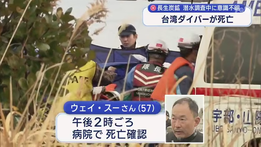 在山口縣宇部市海底的「長生炭坑」,有於太平洋戰爭期間因淹水事故而留下眾多罹難者遺骨,目前正進行由海外潛水員參與、以遺骨收容為目的的潛水調查。7 日,來自台灣的潛水員(57 歲)在作業中失去意識,之後確認死亡。