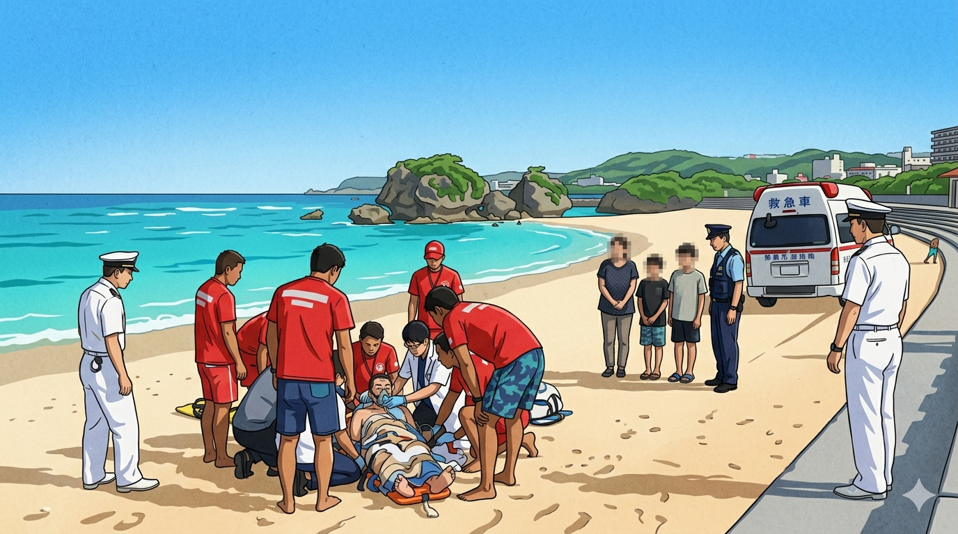 根據那霸海上保安部表示,從台灣前往沖繩旅遊的五口之家在海中游泳時,40多歲的父親將10多歲的兒子扛在肩上游泳,過程中失去平衡,導致兩人同時溺水。