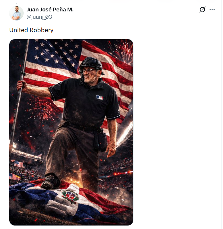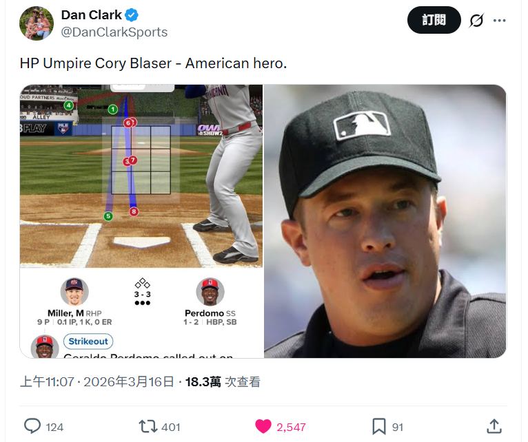 【Lai傳媒 記者爆料網 蔡智銘/綜合報導】WBC世界棒球經典賽4強賽16日上演戲劇性結局,美國與多明尼加一路戰到9局下,多明尼加落後1分,2出局3壘有人的情況下,美國隊終結者投出一記偏低沒有進入好球帶的壞球,卻主審卻判成好球,形成再見三振,也讓比賽在爭議聲中劃下,美國以2比1驚險勝出,闖入冠軍戰,但這一球賽後引起巨大爭議,社群媒體瞬間炸鍋,甚至有球迷諷刺其為「本場 MVP」,尤其球迷發現這名主審Cory Blaser還是一名美國籍的裁判,讓不少網友紛紛在網路發言狂酸他是「true American hero」,還有人AI設計出美國隊「21號」球衣,表示已經下單購入,讓這場精彩的多美大戰完全失了焦。
