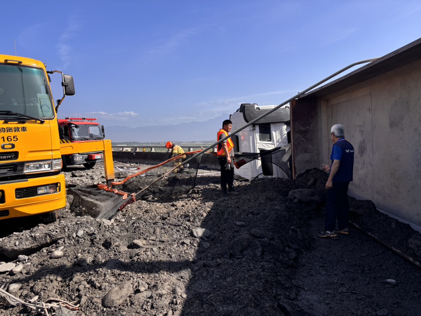 砂石車翻覆。記者王俊勝 翻攝,下同