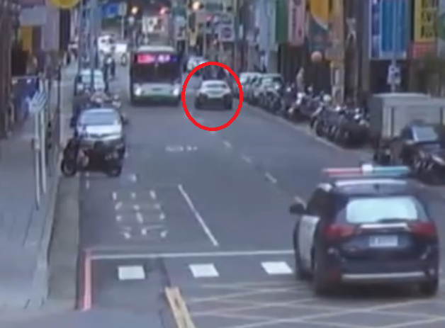 嫌犯駕車拒檢並衝撞警車逃逸(紅圈處)。翻攝畫面
