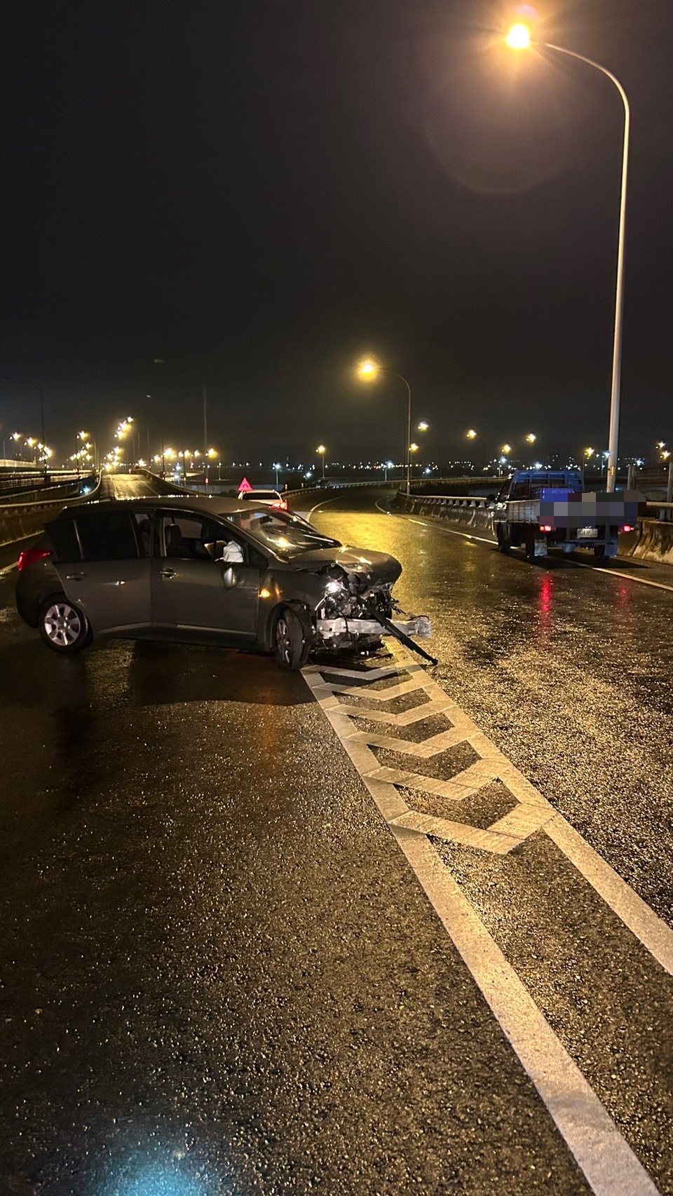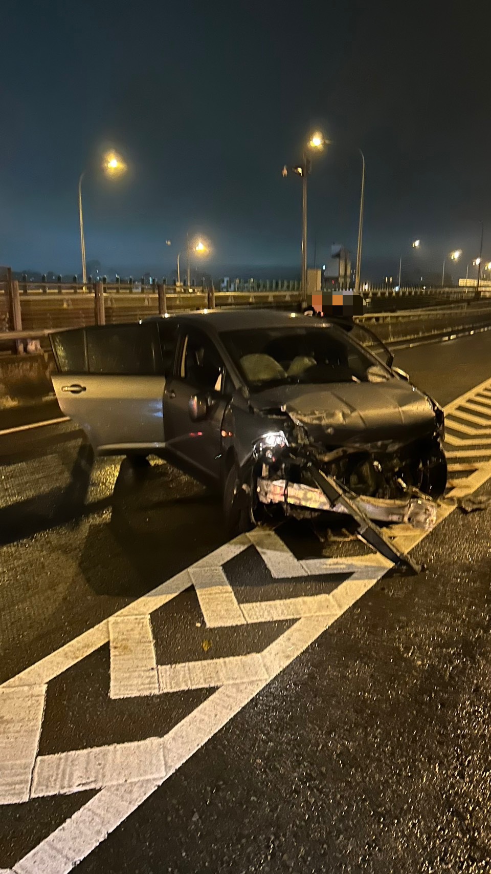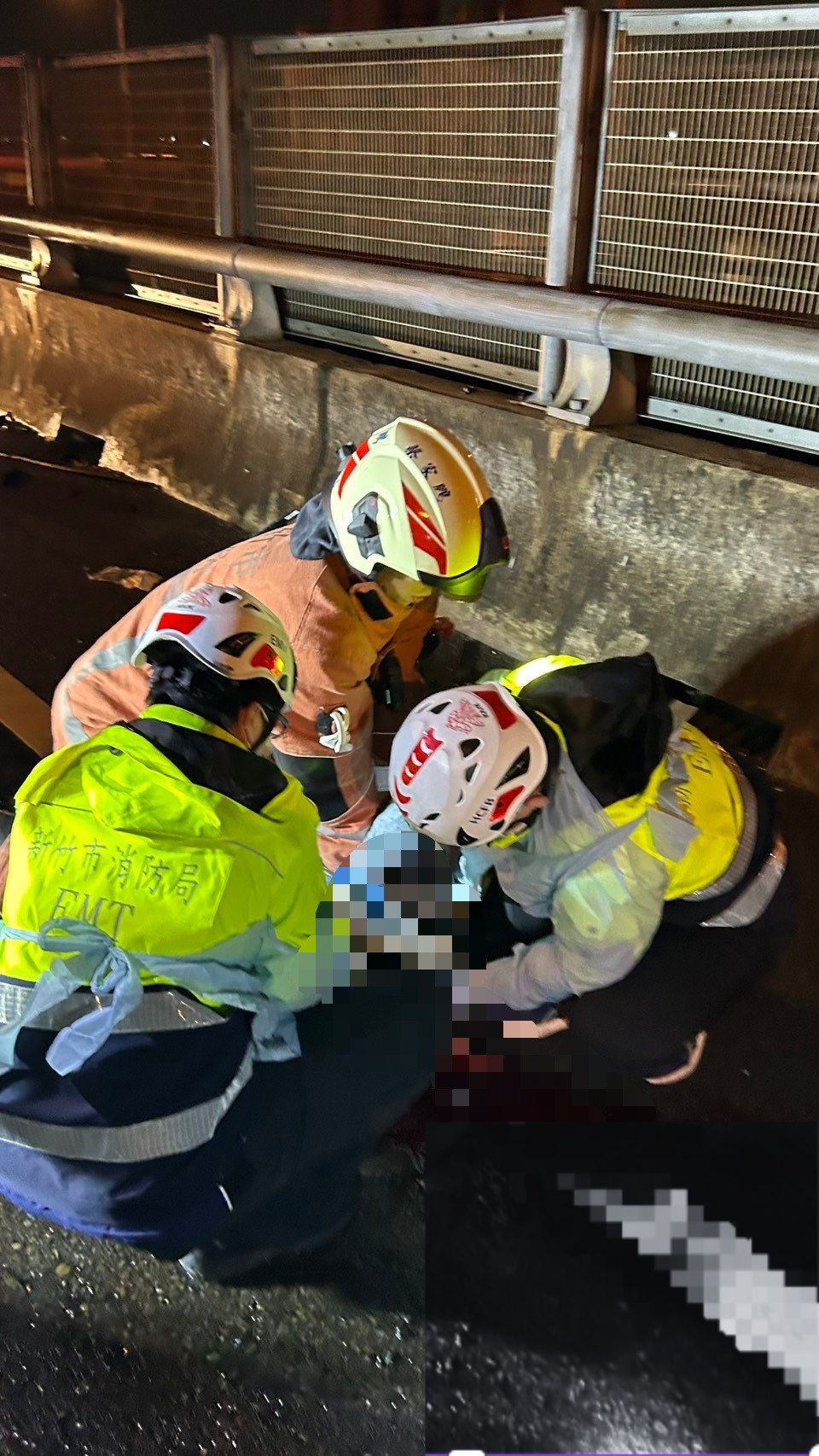 消防隊員到場發現係1輛自小客車自撞護欄,駕駛年約45歲男子拋出車外,意識不清,為外傷OHCA、身上有多處擦傷、頭部有開放性傷口、左大腿封閉性骨折。