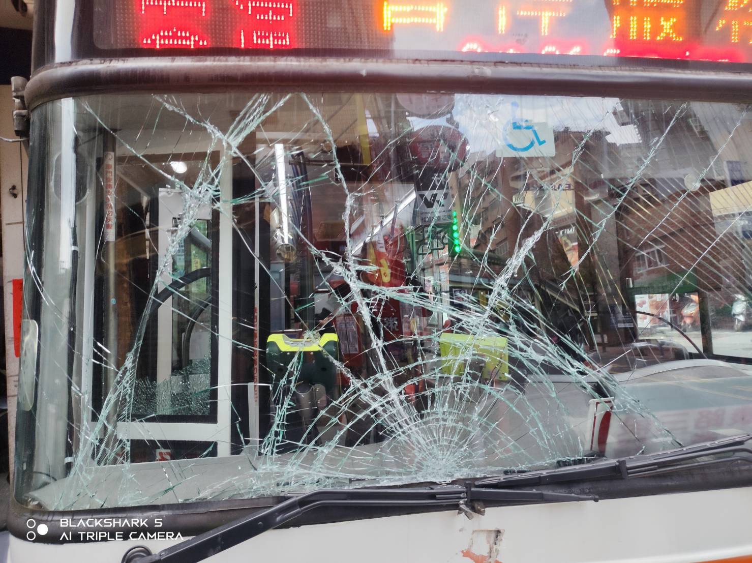 公車擋風玻璃碎裂。翻攝畫面