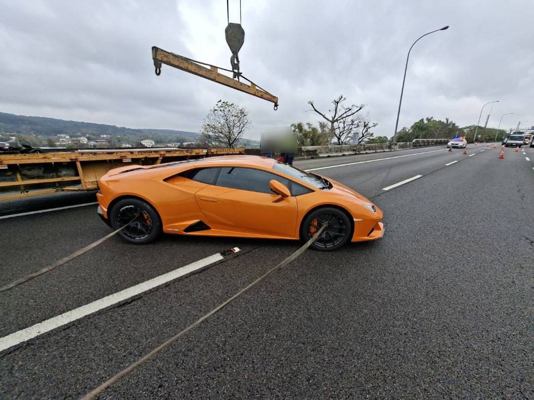 【Lai傳媒、記者爆料網/周庭慶/苗栗報導】千萬超跑藍寶堅尼「小牛」出事了!今(10)日上午10時許,1輛亮橘色藍寶堅尼「小牛」行經國道1號苗栗銅鑼路段自撞護車體打橫佔用兩個車道,駕駛未受傷,吊車隨即到場將該車吊離。據了解,車是要前往台中參加車聚途中因到不明物體發生意外,造成輪胎、鋼圈及車身受損。