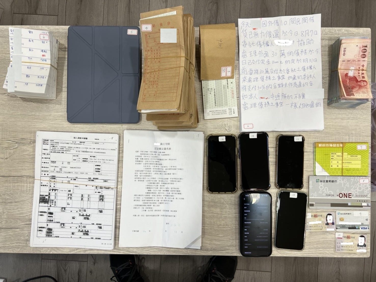 警方共查扣現金137萬8500元、BMW自小客1部、BENZ自小客1部、買賣契約書、納骨塔數量登記表、工作筆記本、客戶資料1比、教戰手冊1批、犯罪手機20支、筆電2臺、存摺23本、銀行卡13張等證物,全案依涉嫌組織犯罪防制條例、詐欺犯罪危害防制條例、洗錢等罪嫌解送橋頭地檢署偵辦,犯嫌李姓男子等5人聲押獲准,餘7人以10至30萬元不等金額交保。