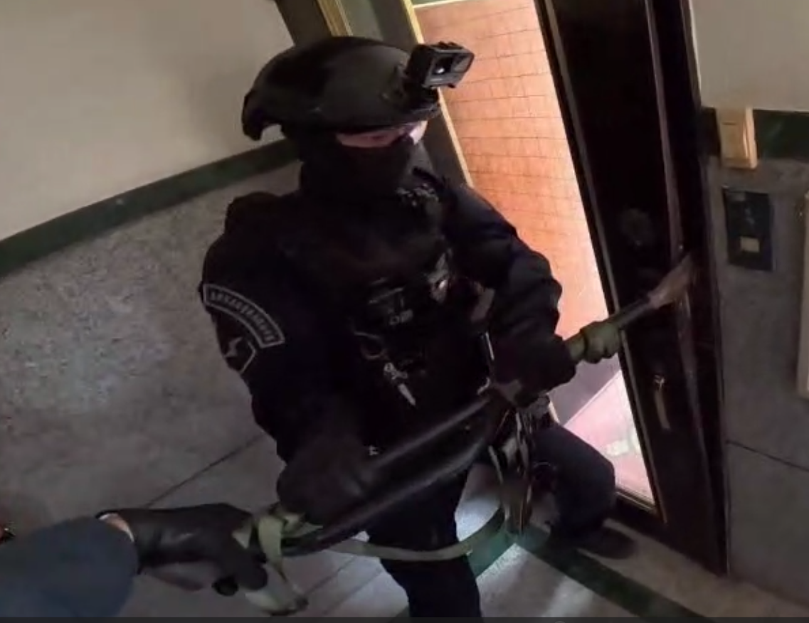 警方破門攻堅逮捕假藉販賣靈骨塔詐騙集團成員。翻攝畫面