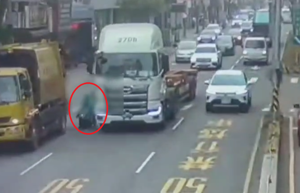 桃園八德機車與拖板車相撞(紅圈處),造成女騎士及1歲女兒OHCA。翻攝畫面
