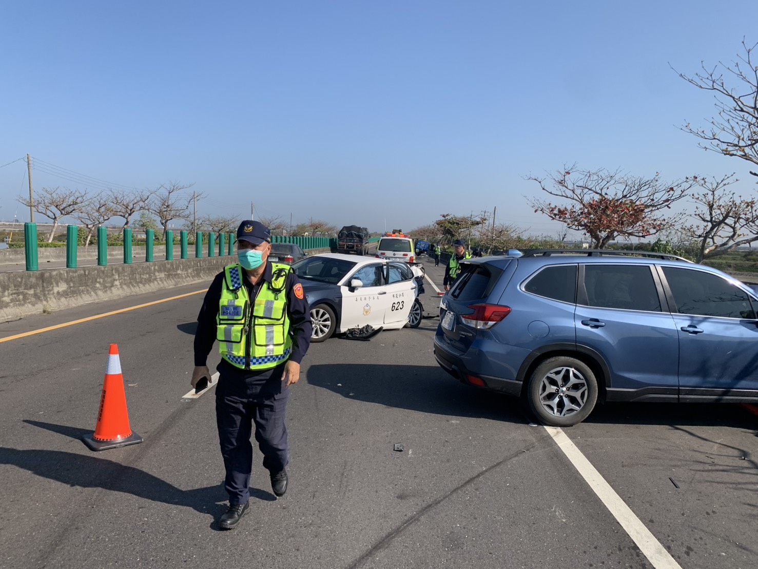 布袋分局表示 今日上午本分局布袋派出所員警獲報至台61線西濱快速道路北上276.3K處理交通事故,警方到場後全程依相關事故處理程序,擺設交通錐警戒與實施交通疏導,事故處理結束欲返所時,突遭後方一部自小客車撞擊,造成車損,所幸均無大恙,雙方經酒測後均無酒精反應,全案現由本分局依相關事故程序處理中。