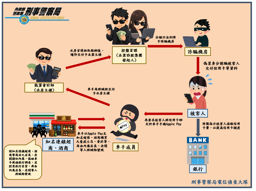 刑事局電信偵查大隊指出,本案詐欺集團係先指揮電信詐欺機房成員冒用政府機關名義,向民眾誆稱涉及刑事案件,致被害人交付名下提款卡、信用卡,再誘騙被害人向銀行申請各種借貸或交割股票、債券變現將款項匯入被害人所屬信用卡繳款帳戶,同時向銀行申請以預繳卡費方式提高刷卡額度,並將被害人信用卡綁定至集團車手所持用手機「Apple Pay」方式,前往事先串通的知名酒商、連鎖超商及餐酒館大量刷卡購買威士忌、菸品等商品,或以假包場名義進行刷卡套現,將信用卡額度洗劫一空。