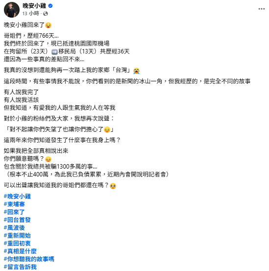 更引發討論的是,晚安小雞稍早才在社群發文,提到自己歷經36天拘留與監獄生活,還語帶保留表示「很多事情不能說」,甚至提及涉及金額高達千萬,讓外界充滿想像空間。