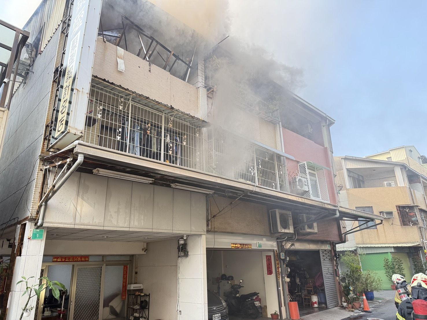 這棟3層樓連棟建物,起火點在1號3樓陽台鐵皮加蓋,火勢猛烈波及隔壁3號,燒掉約25平方公尺,濃煙密佈巷弄,消防7點56分抵達後馬上入室佈線射水,同時搜救確認無人困火場,3名屋主已自逃,沒人受困傷亡。