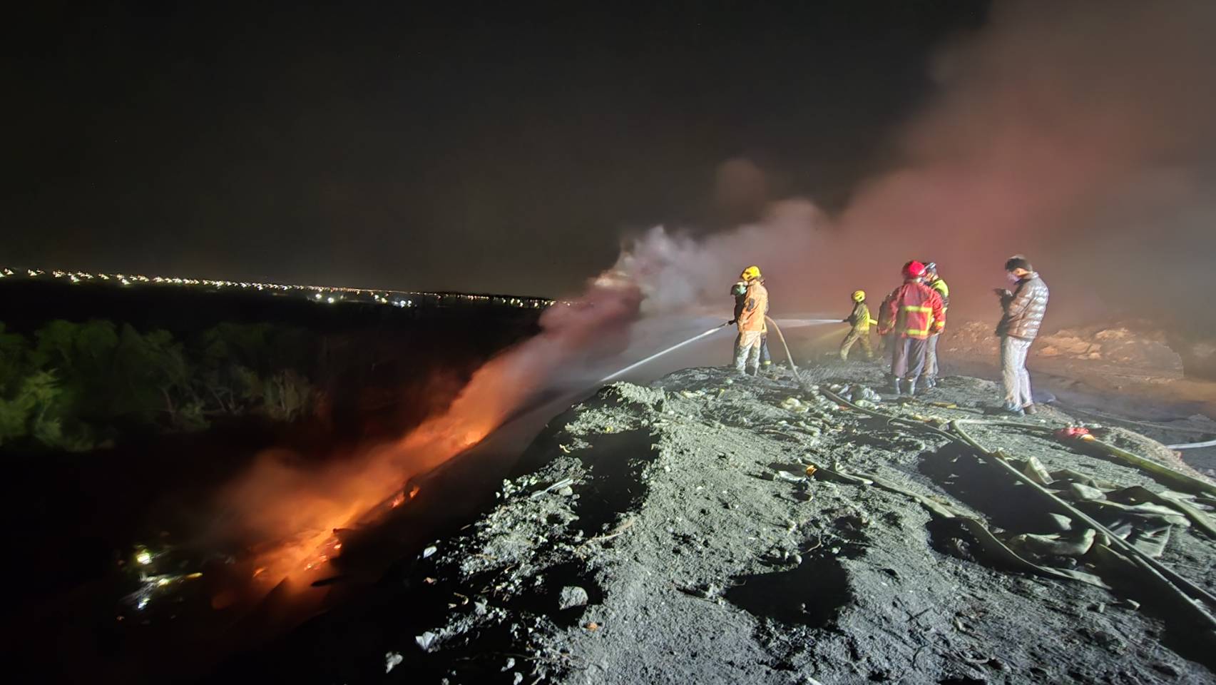 現場煙害嚴重,周邊居民凌晨被吵醒,消防監測空品正常,通報環保局火調科查起火原因,疑自燃或餘燼,城西二期去年已燒多次,市府喊加強巡檢防火,民眾心痛「垃圾山又燒,空氣臭死人」。