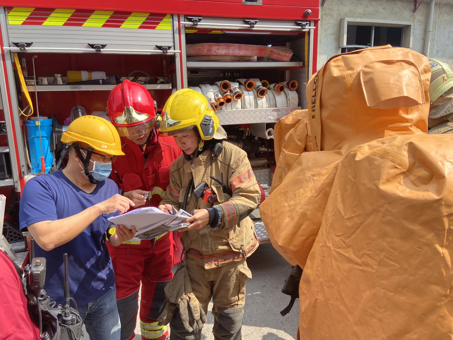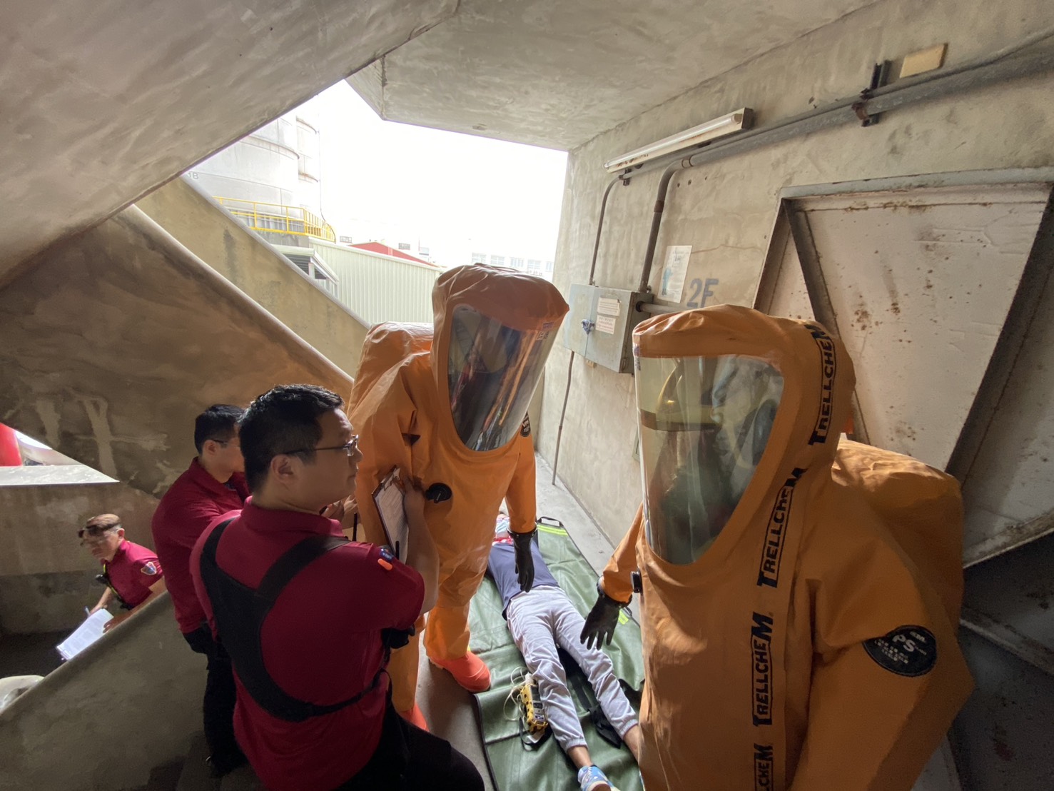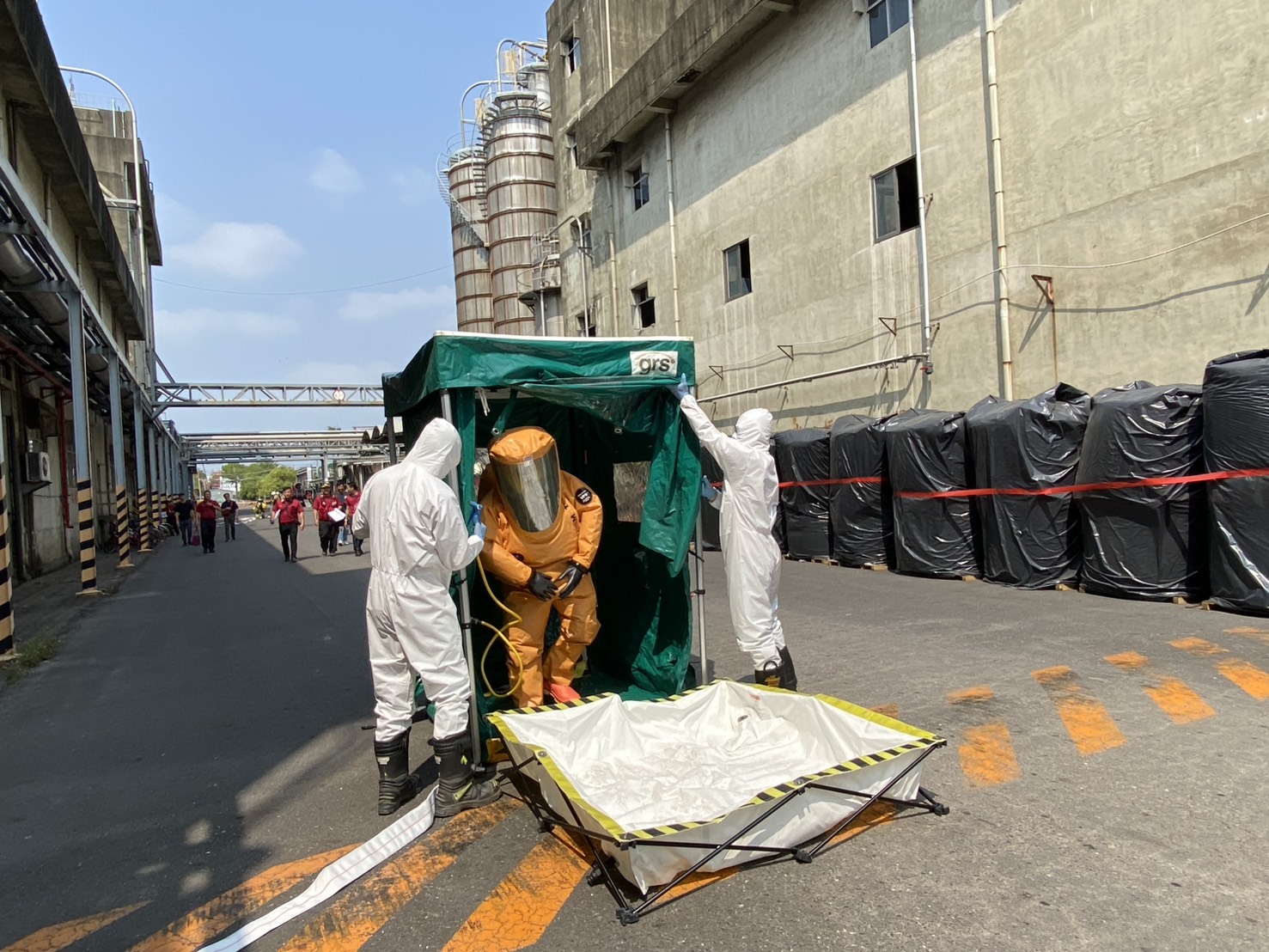 演練一開始,由廠內人員扮演第一線應變,發現化學物質洩漏後立即拉警報、疏散周邊;消防隊抵達現場後,依標準程序先做危害辨識、劃定管制區、制定搶救方案,官兵穿上化學防護衣,攜帶偵檢儀器進入火場模擬區,執行人命搜救、洩漏止漏與降溫等戰術,還特別模擬一名消防員墜落受困的緊急狀況,測試隊友快速救援與自保技巧,整個過程緊張刺激,考驗官兵現場判斷力。
