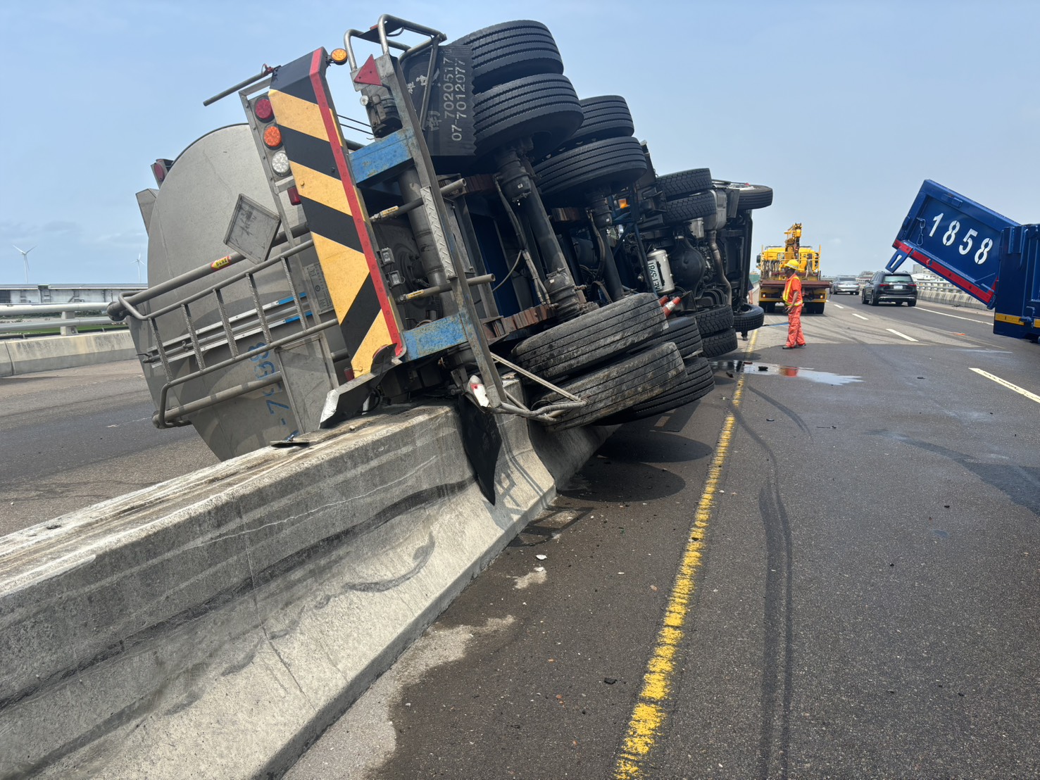 槽車自撞護欄再撞貨車翻覆。翻攝畫面