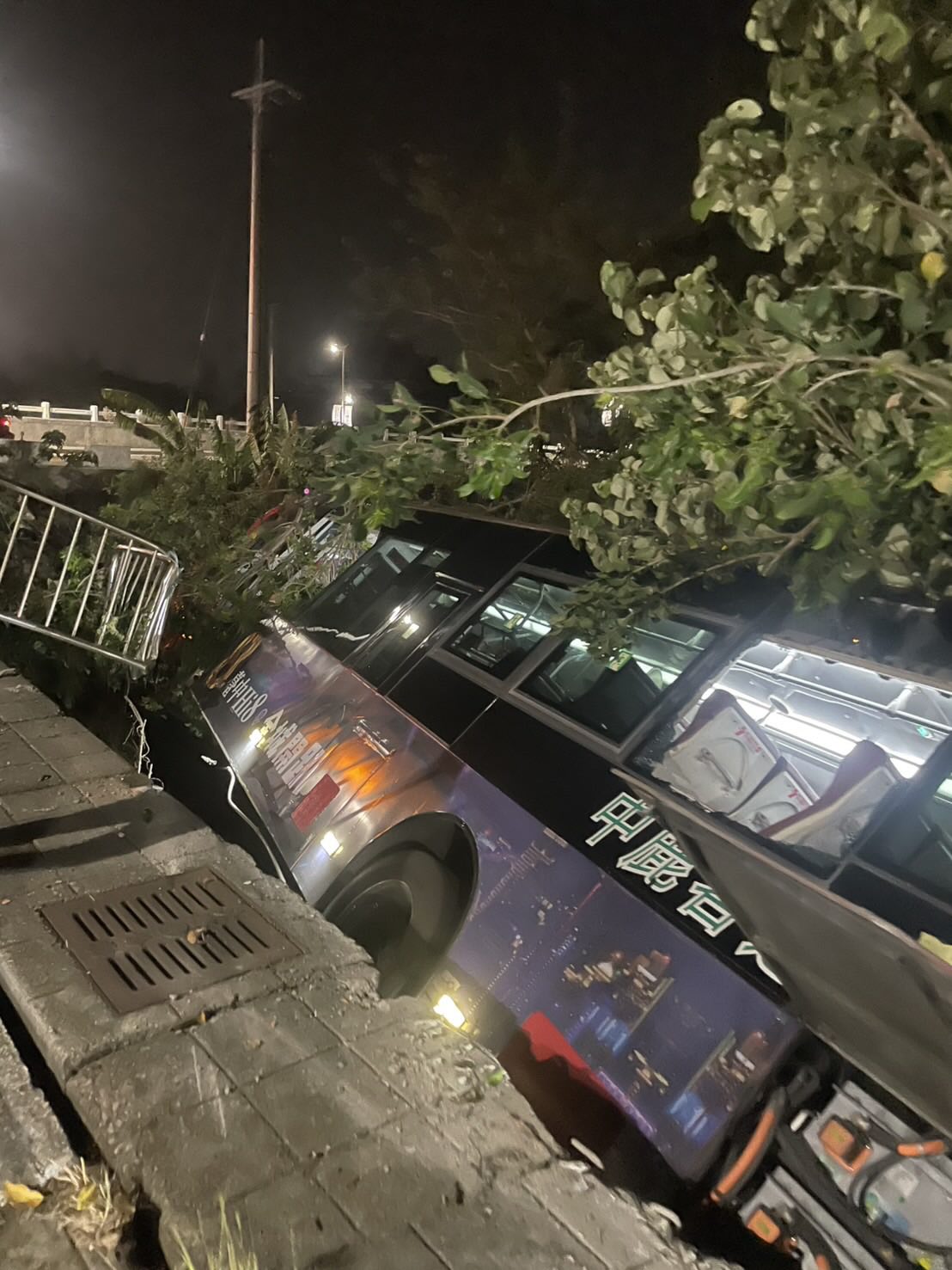 公車翻覆路旁。翻攝畫面