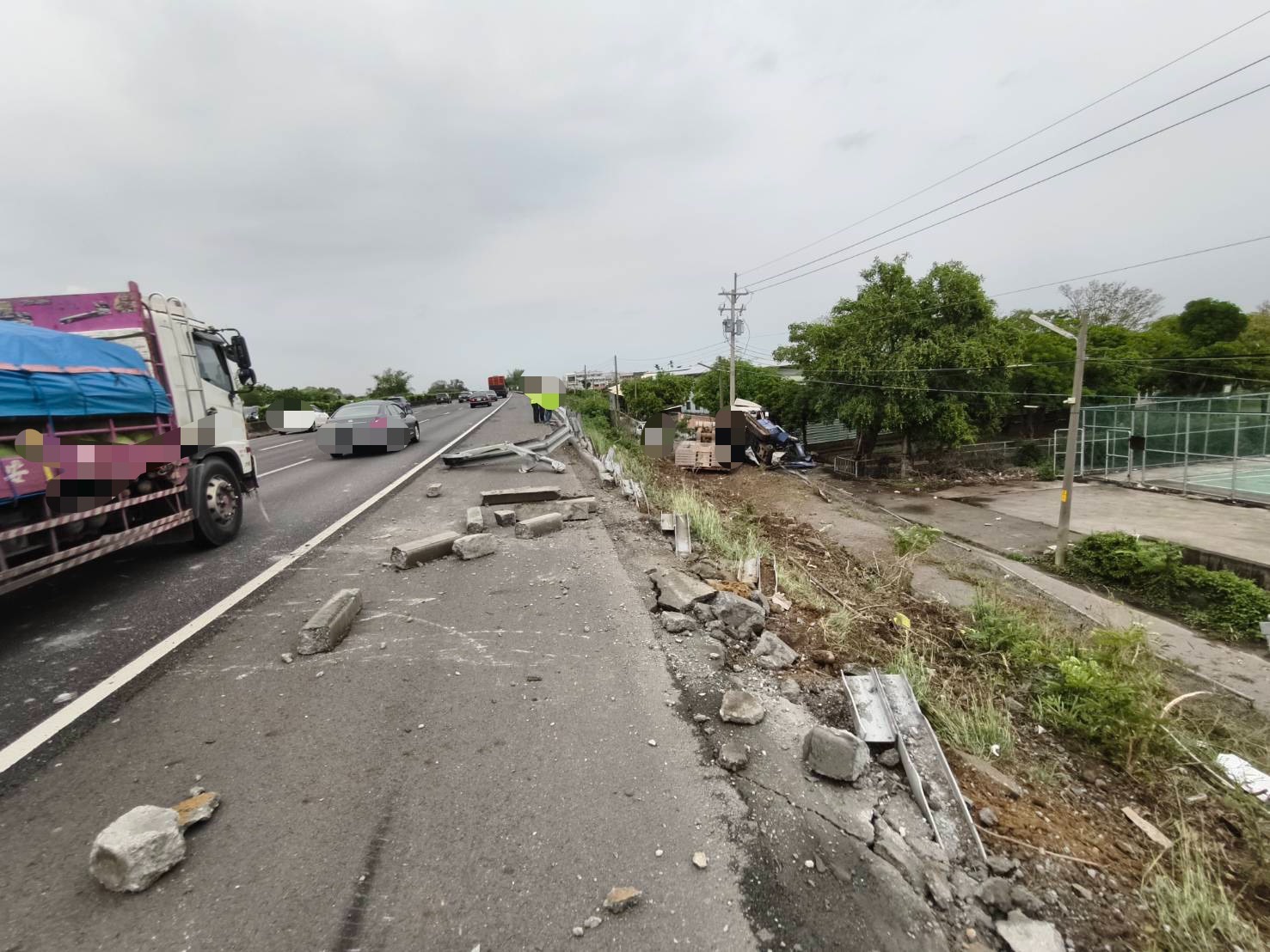 國道1號嘉義路段板車撞護欄翻落邊坡。翻攝畫面