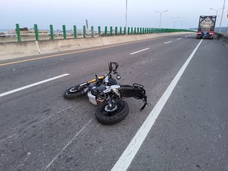 新竹縣消防局表示,今日18時15分接獲桃園119轉報,於新竹縣新豐鄉西濱南下58.7k高架(桃119)發生車禍,派遣新豐分隊前往救援,現場為重型機車與轎車發生交通事故,重型機車駕駛王姓男子(55歲)受傷、意識清楚,由救護車送往湖口仁慈醫院。
