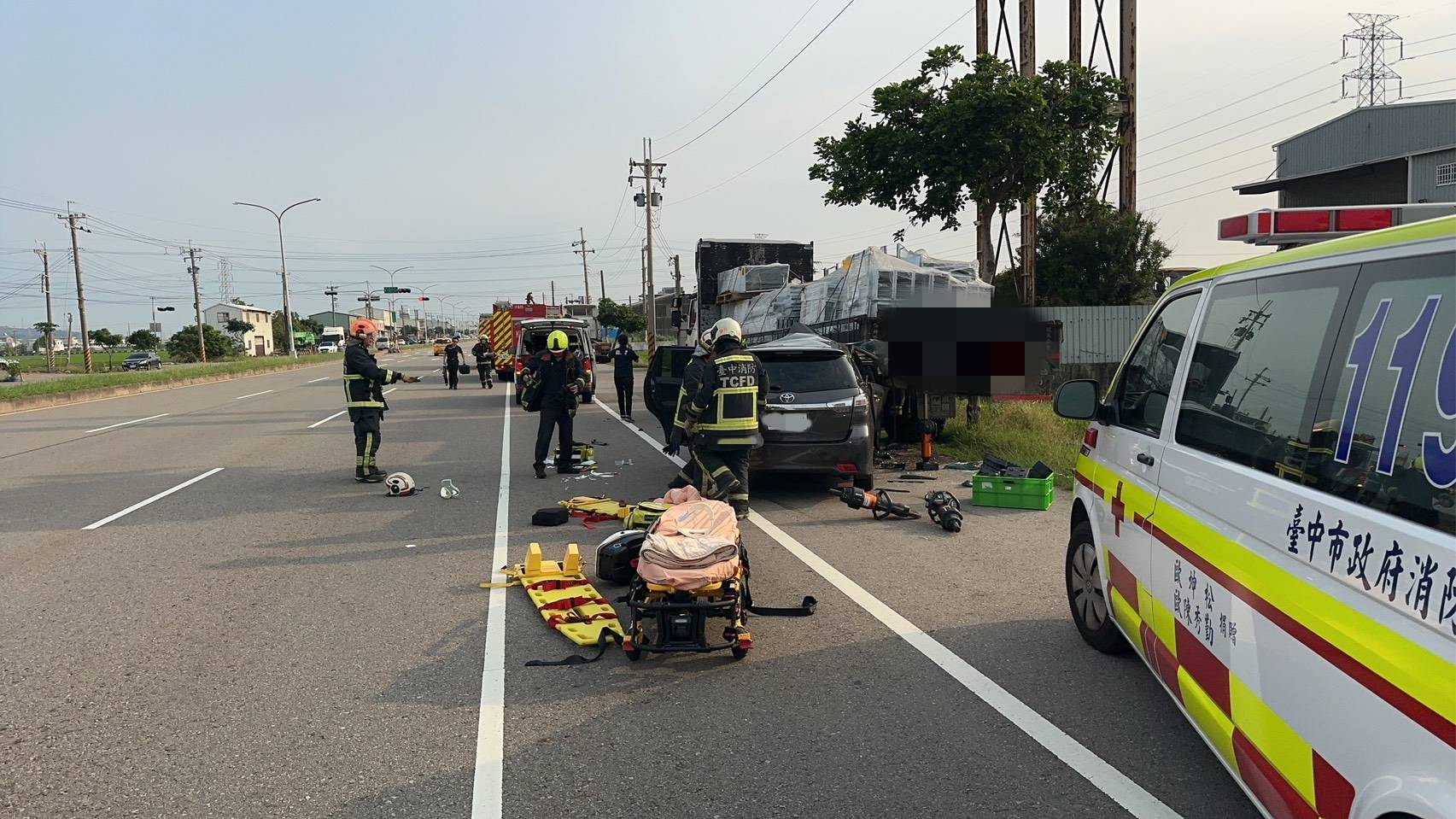 台中市消防局表示,4月21日16時21分獲報龍井區中華路三段發生車禍,報案人表示現場自小客撞大貨車,受傷人數不明,派遣龍井及沙鹿分隊,出動消防車3輛、救護車2輛,人員14名,由龍井小隊長楊鈞傑帶隊前往救援。