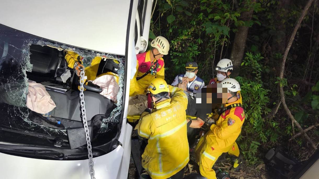 消防局接獲通報後,立即派遣大社消防分隊趕赴現場搶救。人員抵達後發現,事故車輛車頭朝下深陷邊坡,車尾懸空翹起,僅靠樹木支撐固定,周邊地勢崎嶇、雜草叢生,救援空間狹小,稍有不慎恐造成車體滑落,增加救援風險。