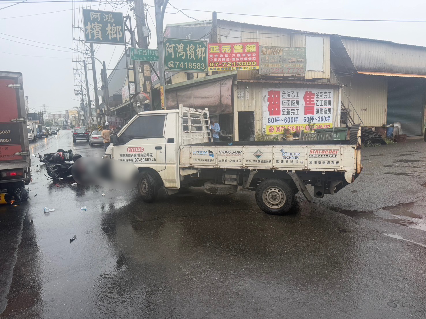 【Lai傳媒、記者爆料網/周庭慶/高雄報導】高雄市鳳山區今(25)日上午發生連環車禍!鳳山警分局交通分隊10時48分許接獲通報,鳳山區鳳仁路110巷與鳳仁路口發生多車交通事故,立即派遣警力趕赴現場處理,初步了解,係76歲胡姓男子駕駛小貨車沿鳳仁路264巷由南向北行駛至鳳仁路口紅燈右轉,當時鳳仁路快車道上另有兩部機車由西向東直行,見狀緊急煞車不及打滑摔倒,隨後向前滑行碰撞胡男貨車,並波及停等欲左轉鳳仁路110巷之另輛49歲紀姓男子駕駛之小貨車。