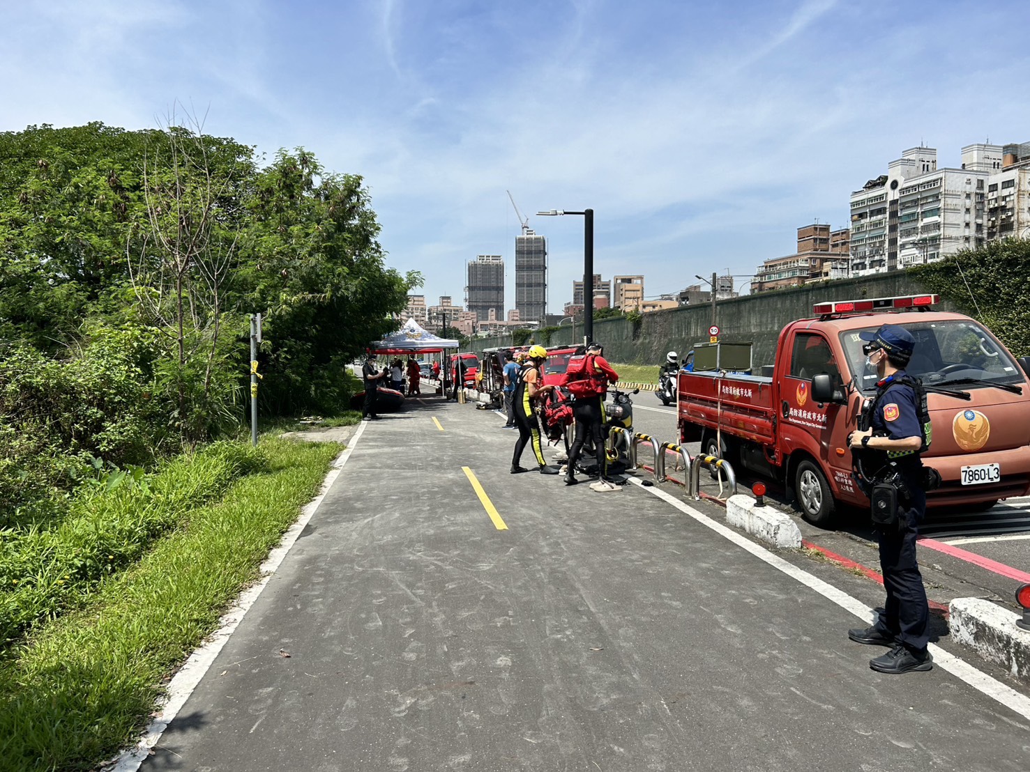 新莊分局依規定拉設封鎖線,鑑識人員到場採證,並聯繫亡者弟弟至所製作相關筆錄初步排除外力介入之可能,全案依規定報請新北地檢署檢察官進行刑事相驗,至於墜溪失蹤女子警消持續搜尋中。