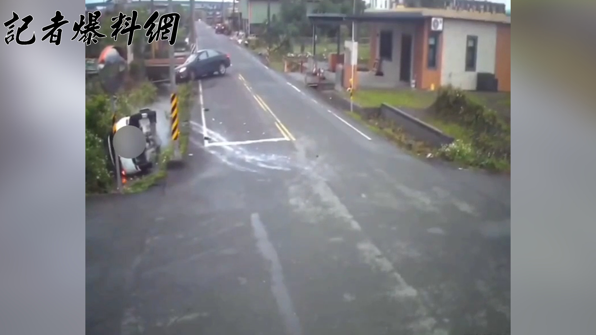 ▲事故發生後,黑車旋轉270度直至撞擊路旁電桿才停下;白車則甩尾後直接栽進水圳。(翻攝畫面)